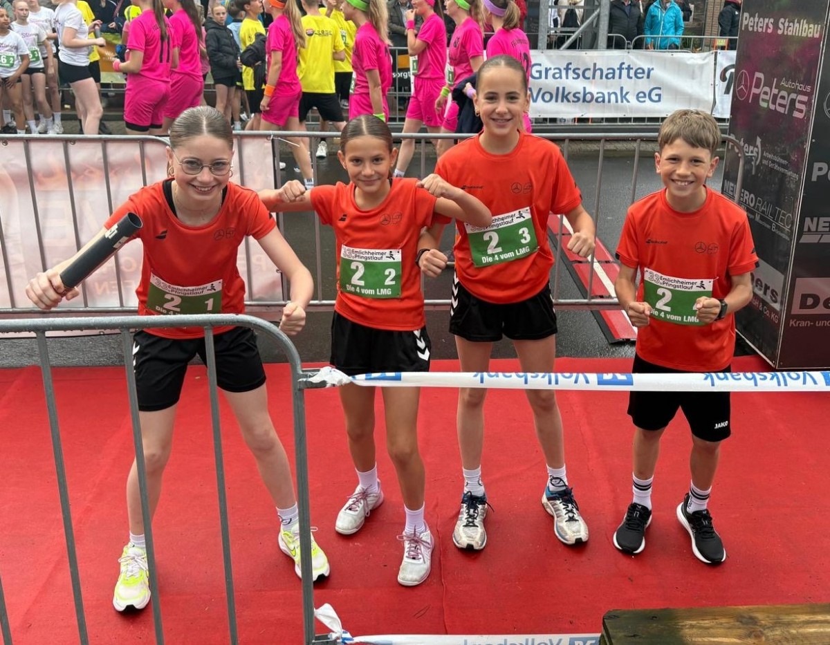 Philine van der Sar, Neysa Clemens, Gesine Annen und Matis Hölman gewinnen die Schüler Staffel mit dem Namen "die 4 vom LMG" souverän. Sie haben die 4mal 1km in 16:02 Minuten absolviert und gehörten damit auch deutlich zu den besten Läuferinnen und Läufern in ihrer Altersklasse.