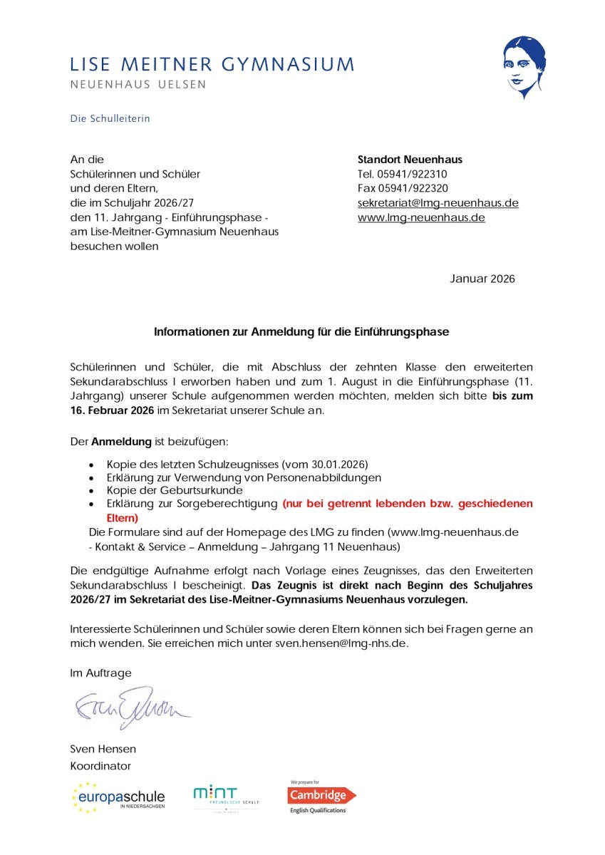 Informationen zur Einführungsphase Alle notwendigen Informationen zur Einführungsphase, zur Organisation und zu Wahlmöglichkeiten finden sich auf dieser Seite. Informationen zur Anmeldung für die Einführungsphase Anmeldeformulare für den Jahrgang 11 Anmeldung Einführungsphase Einwilligungserklärungen Erklärung zur Sorgeberechtigung Flyer Sek. II Informationsblatt gemäß Art. 13 ff. Datenschutzgrundverordnung (DSGVO) Informationen zum Bildungs- und Teilhabepaket